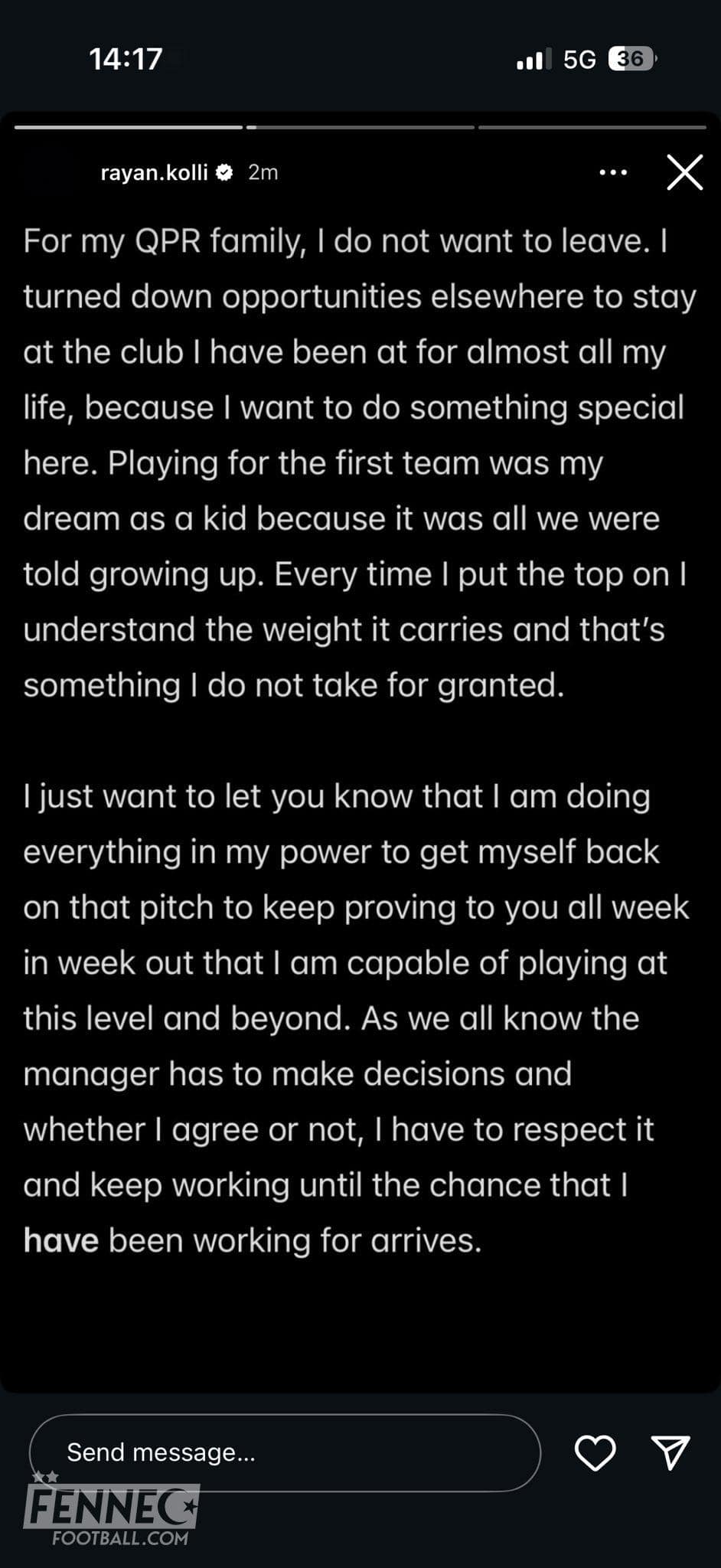 Concernant sa situation en club, Kolli affirme qu’il n’a jamais cherché à quitter QPR. Il confie avoir refusé plusieurs opportunités ailleurs pour rester dans le club où il a grandi, animé par le rêve de s’y imposer en équipe première. Il assure tout mettre en œuvre pour regagner sa place sur le terrain et prouver chaque semaine qu’il a le niveau.