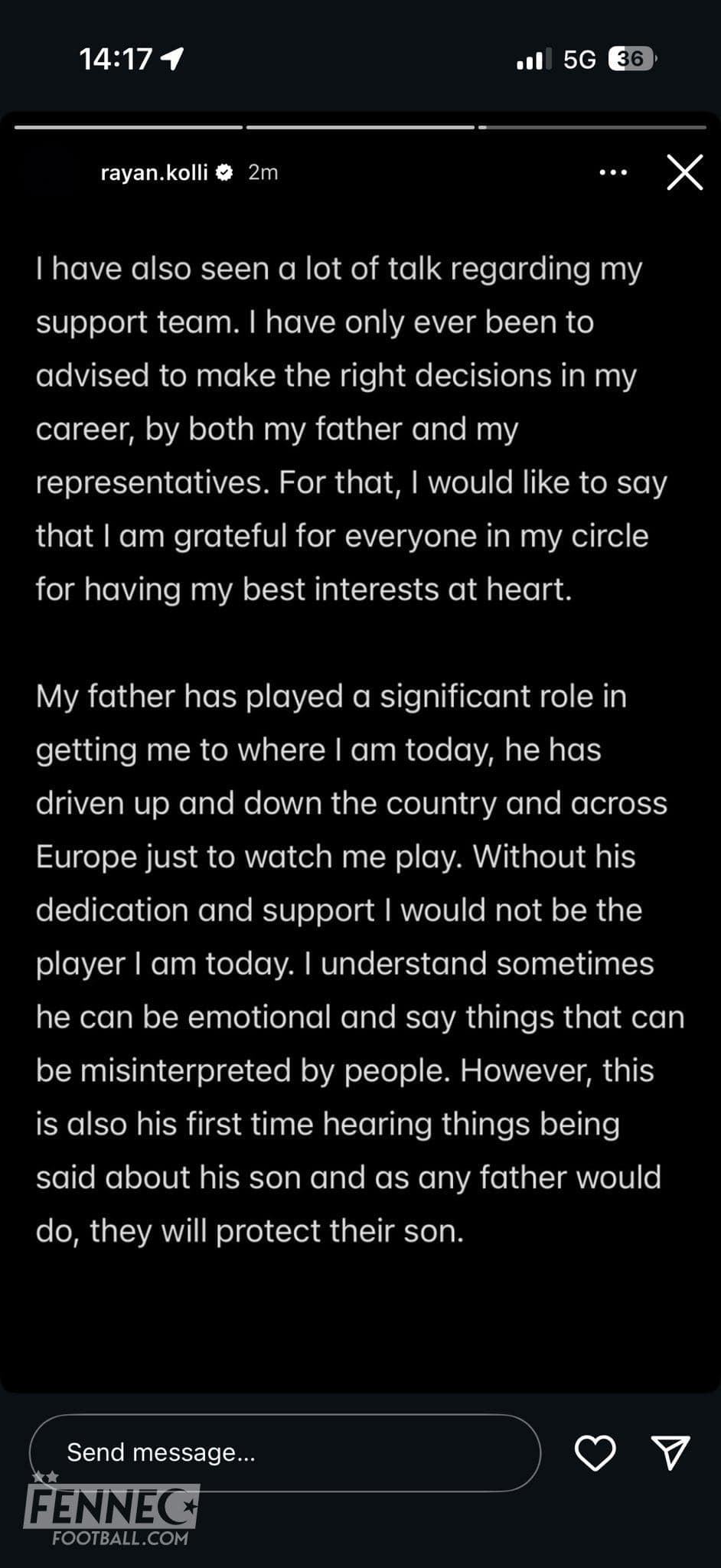 Dans son message, Kolli explique avoir vu « beaucoup de choses circuler » à son sujet ces derniers jours. Il remercie d’abord ceux qui l’ont soutenu durant les périodes difficiles de sa jeune carrière, avant de démentir formellement l’idée selon laquelle il aurait pris ses distances avec l’Algérie. Selon lui, le fait d’avoir archivé ses publications n’a « rien à voir » avec la sélection. Il déplore que ces rumeurs aient entraîné une vague d’insultes et d’attaques en ligne visant sa famille et lui-même.