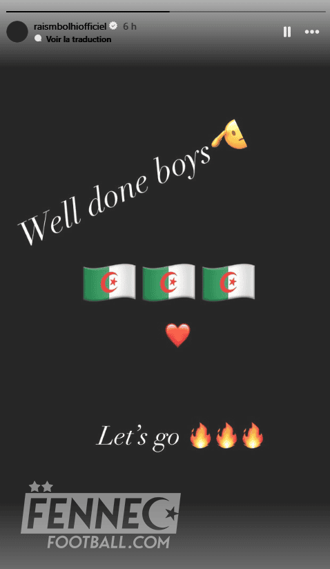 L’ancien capitaine des Verts, véritable légende du football algérien, a tenu à exprimer sa fierté à travers une story publiée sur son compte Instagram, où il a écrit : « Bravo les gars. Allez, c’est parti ». Un message court mais fort de sens, symbolisant son attachement indéfectible aux Fennecs.