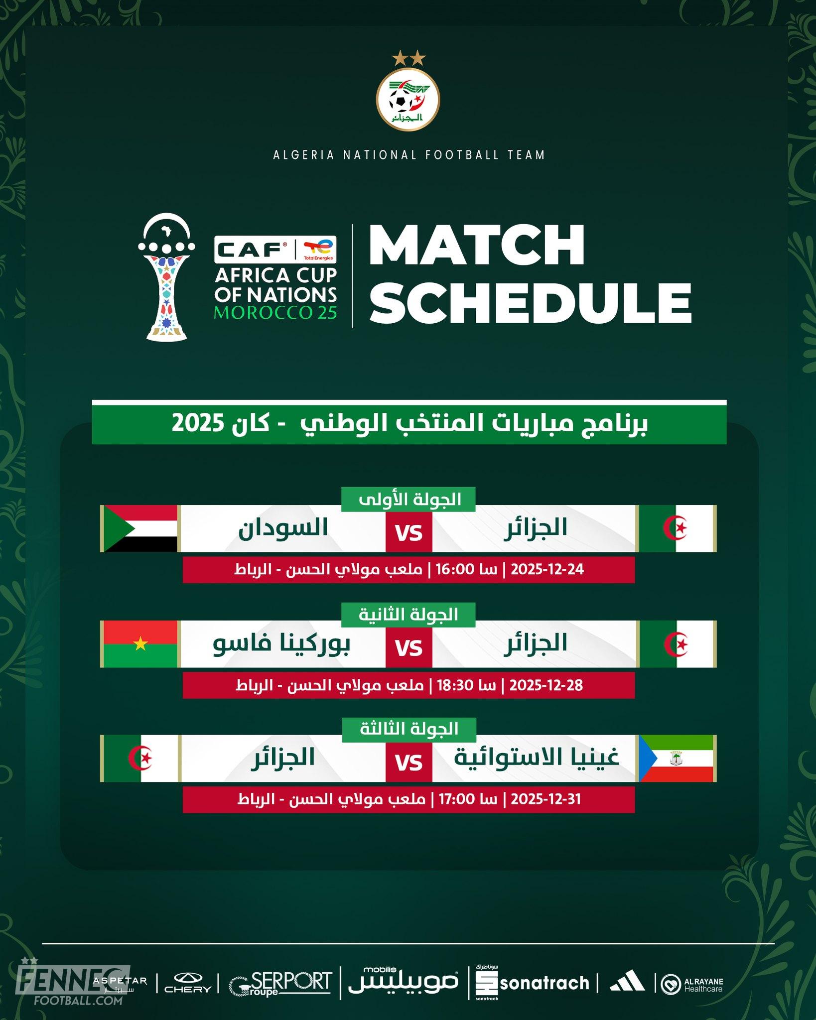 Le premier match opposera l’Algérie au Soudan, le 24 décembre 2025 à 16 h 00. Une entrée en matière à ne surtout pas négliger face à une équipe réputée combative, qui cherchera à surprendre. Les Fennecs devront faire preuve de rigueur et d’efficacité pour bien lancer leur campagne continentale.