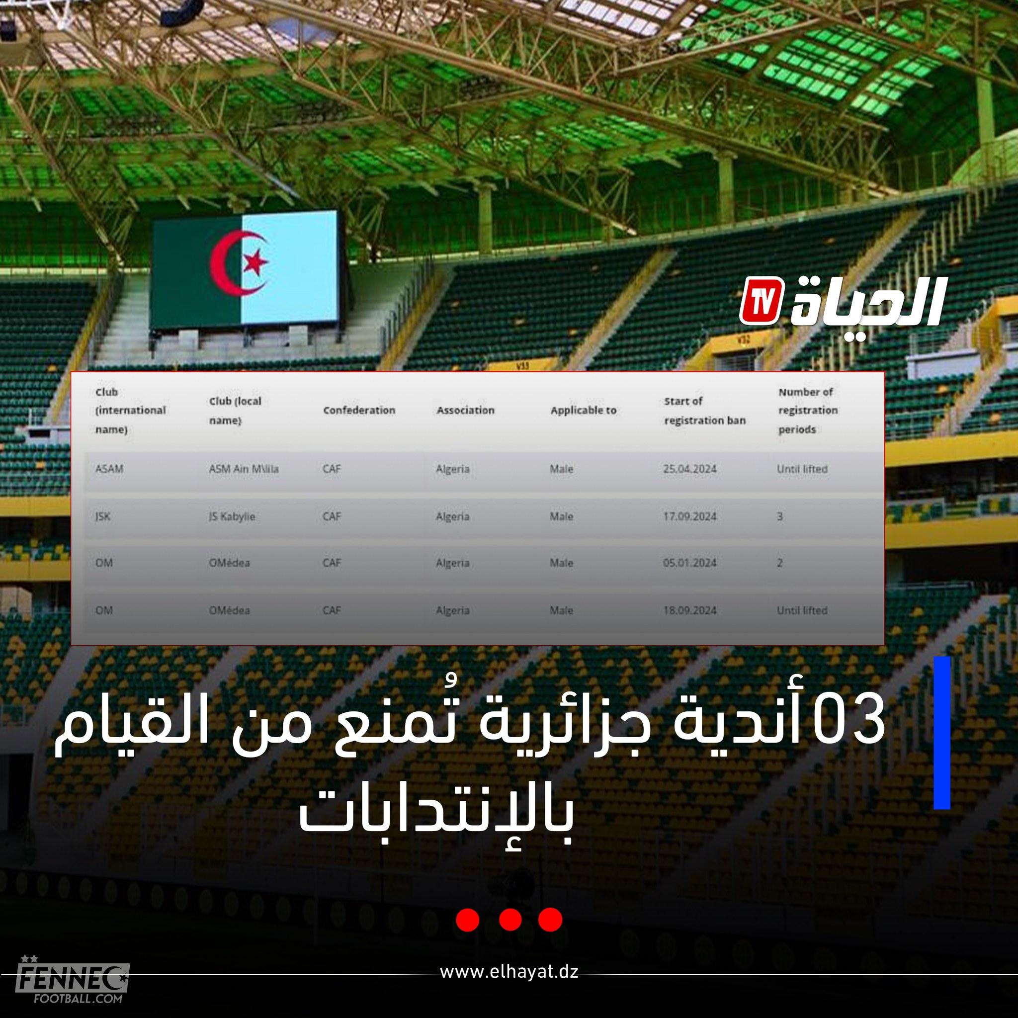 Algérie Foot – La FIFA a révélé que trois clubs algériens seront interdits de recrutement lors des prochains mercatos, à moins de régulariser leurs dettes impayées. Selon un communiqué rapporté par la chaine El Hayat TV, les clubs concernés sont la JS Kabylie, l’Olympique de Médéa, et l’AS Aïn M’lila.