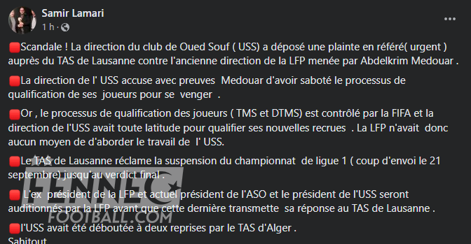 D’après les informations du journaliste Samir Lamari, l’USS accuse Medouar, preuves à l’appui, d’avoir saboté le processus de qualification des joueurs du club dans un acte de vengeance. Selon l’USS, ce sabotage aurait entravé la qualification des nouvelles recrues du club, malgré le fait que le processus de qualification des joueurs (TMS et DTMS) soit contrôlé directement par la FIFA. La direction de l’USS avait en réalité toute latitude pour inscrire ses joueurs, et la LFP n’avait aucun pouvoir sur cette procédure.