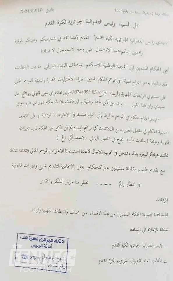 Ces arbitres estiment avoir été injustement écartés sans explications valables ni notification formelle de sanctions. Ils affirment, dans une lettre envoyée à Walid Sadi, ne pas avoir été convoqués devant aucune des commissions de la FAF pour clarifier leur situation.