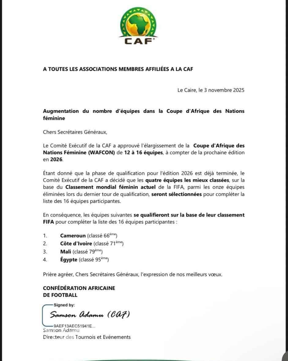 Cette réforme a eu un effet immédiat sur la liste des nations qualifiées, permettant à quatre sélections éliminées lors du dernier tour d’intégrer la phase finale en fonction de leur classement FIFA. Parmi ces équipes figure le Cameroun, pourtant éliminé par l’Algérie lors des qualifications. Les Lionnes indomptables, classées 66e au classement mondial, bénéficient donc d’une requalification administrative, aux côtés de la Côte d’Ivoire (71e), du Mali (79e) et de l’Égypte (95e).