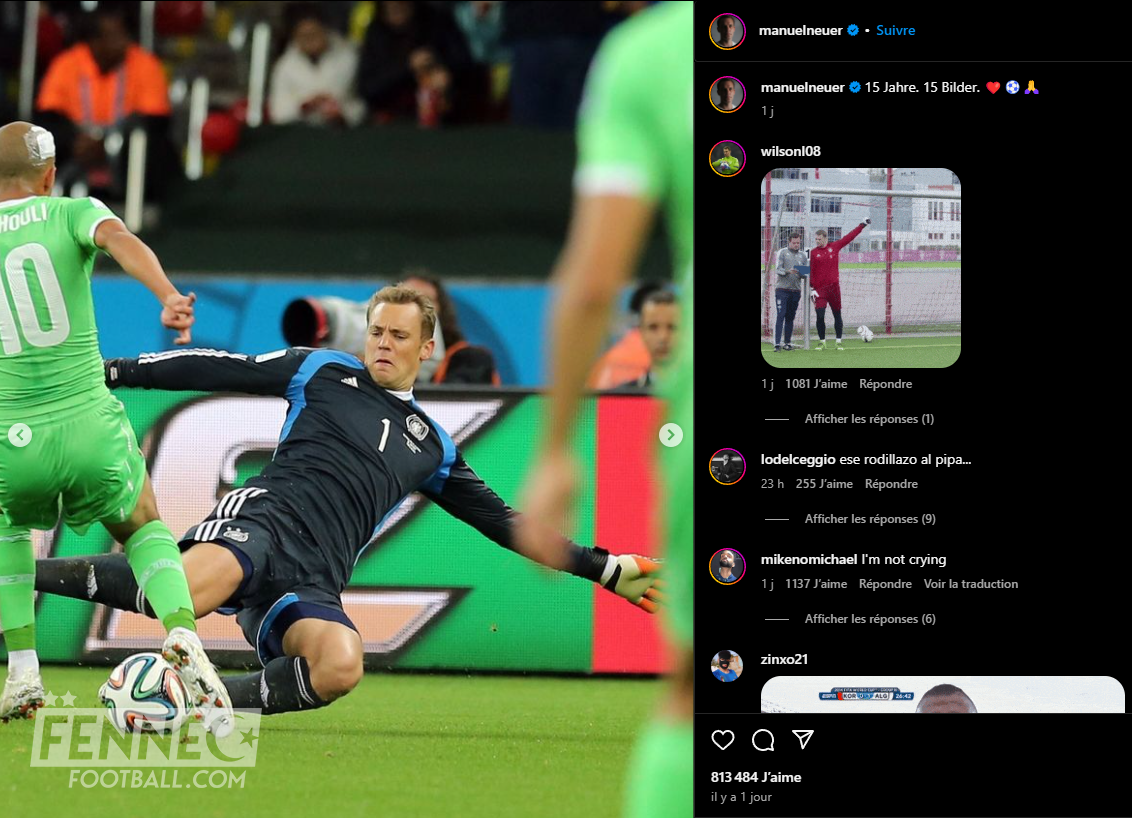 Ce match a également marqué les esprits du côté allemand, symbolisant leur parcours vers le titre mondial. Pour Neuer, ce moment reste gravé dans sa mémoire. Dans un post Instagram accompagné du message “15 ans. 15 images”, le gardien du Bayern Munich a choisi de mettre en avant une photo de son intervention cruciale face à Sofiane Feghouli lors de ce match historique de la Coupe du Monde 2014.