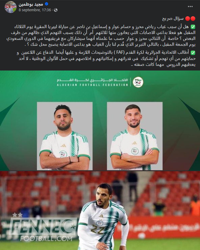 ” L’absence de Riyad Mahrez, Houssem Aouar et Ismaël Bennacer pour le match contre le Liberia, prévu mardi prochain, est-elle réellement due à leurs blessures respectives, ou est-ce lié aux critiques qu’ils ont subies ? Surtout que, d’après nos informations, Mahrez et Aouar devraient participer à leurs matchs de championnat saoudien ce vendredi. Cela remet donc en question la justification donnée concernant leurs blessures. Je demande à la Fédération algérienne de football (FAF) de fournir des explications claires et de défendre les joueurs, en les protégeant de toute attaque ou remise en question de leurs capacités, leur engagement ou leur loyauté envers les couleurs nationales. Personne n’a le droit de leur donner des leçons, quelle que soit sa position. “, a écrit Madjid Boutemine.