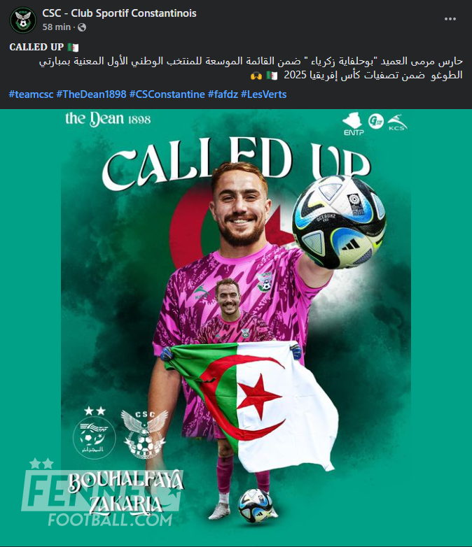 Algérie Foot – Le gardien de but du CS Constantine, Zakaria Bouhalfaya, a été inclus dans la liste élargie du sélectionneur de l’équipe d’Algérie Vladimir Petkovic pour les matchs contre le Togo, comptant pour les qualifications de la Coupe d’Afrique des Nations 2025.