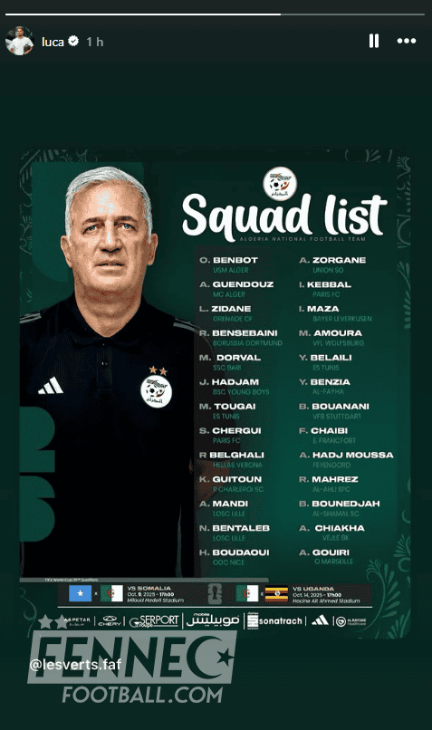 Sur son compte Instagram, Luca Zidane n’a pas tardé à réagir. En repartageant simplement la liste officielle des Verts, il a laissé transparaître un message clair : celui de son engagement et de sa fierté de rejoindre l’équipe nationale. Ce geste sobre, sans commentaire additionnel, peut être interprété comme une manière de laisser le terrain parler pour lui. Une attitude qui traduit à la fois humilité et détermination, et qui a suffi à susciter l’enthousiasme des supporters algériens.