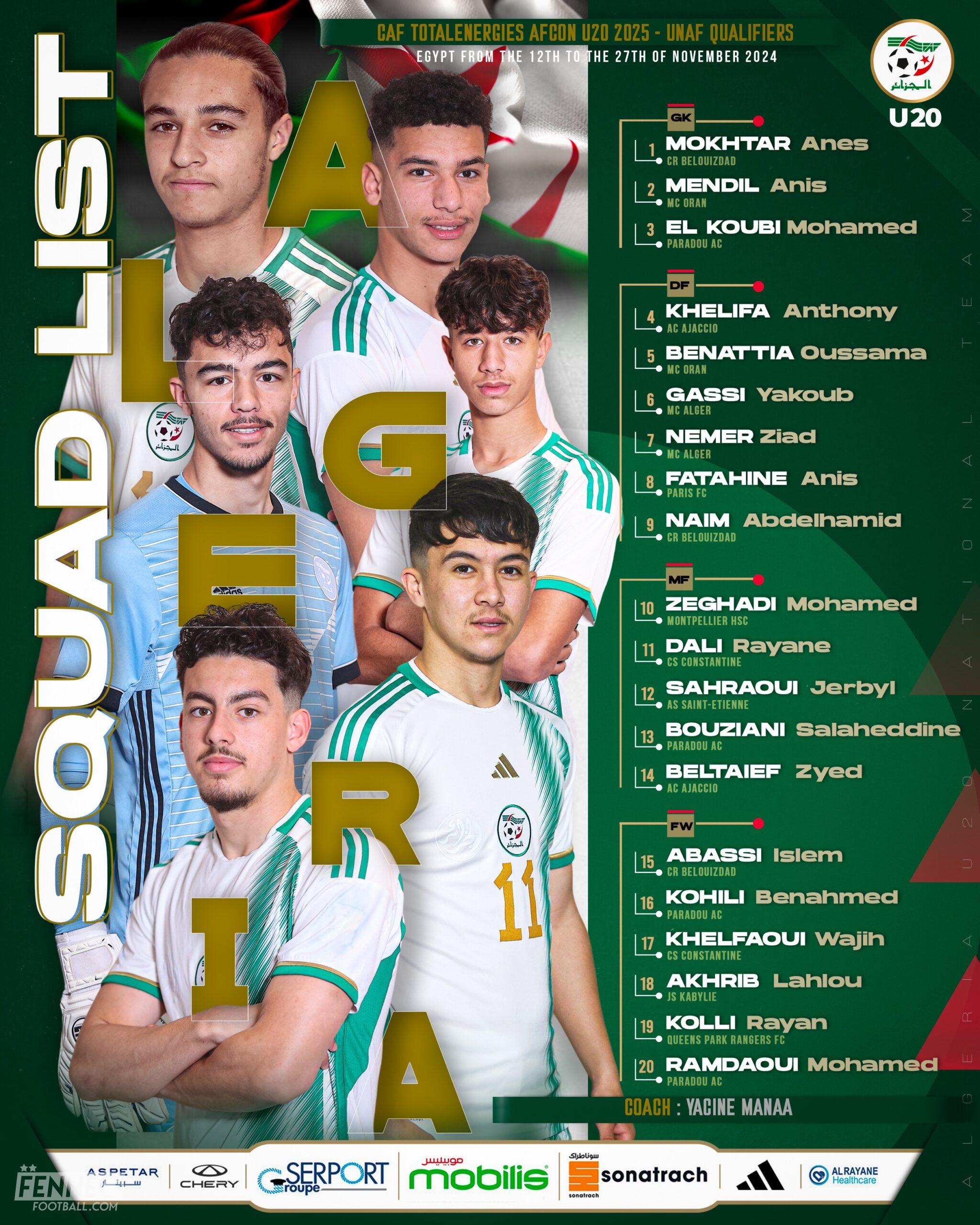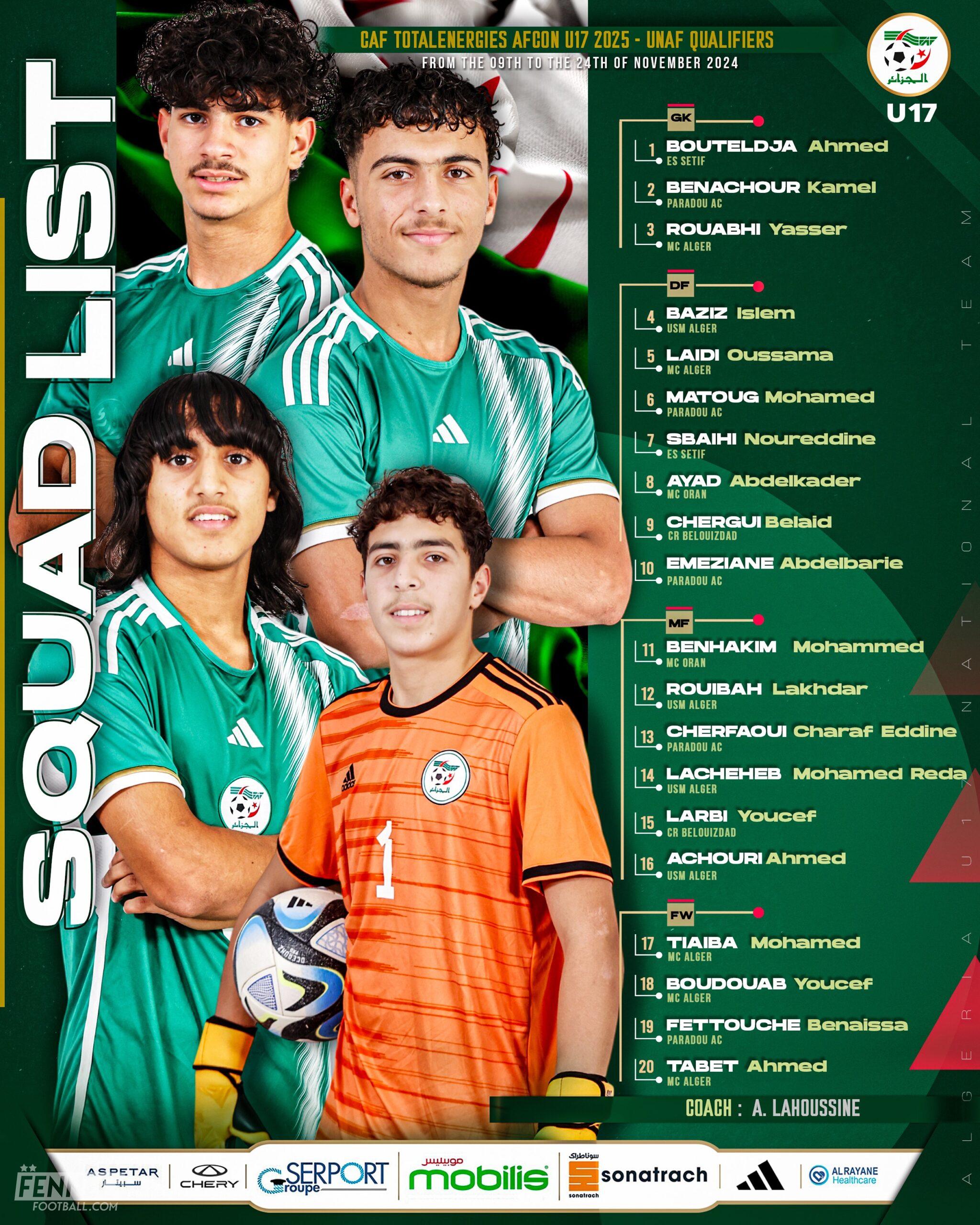 Algérie Foot – La Fédération algérienne de football (FAF) a dévoilé les listes des joueurs de l’équipe d’Algérie U17 et U20 pour les tournois de l’Union nord-africaine de football (UNAF), étapes qualificatives pour la phase finale de la Coupe d’Afrique des Nations (CAN) dans leurs catégories respectives.