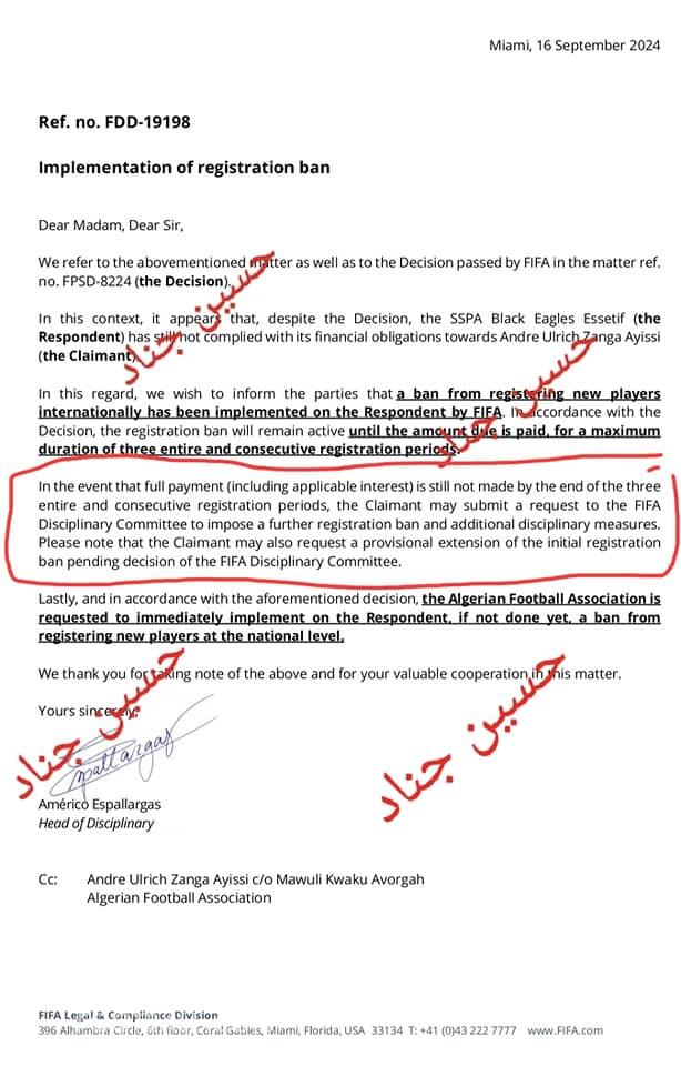 Le dernier paragraphe du courrier attire particulièrement l’attention, car la FIFA exige également que la Fédération Algérienne de Football (FAF) applique immédiatement l’interdiction d’enregistrement de joueurs au niveau national si cela n’a pas encore été fait. Cela signifie que la FAF elle-même est sous pression et pourrait être confrontée à des sanctions si elle ne respecte pas cette directive.