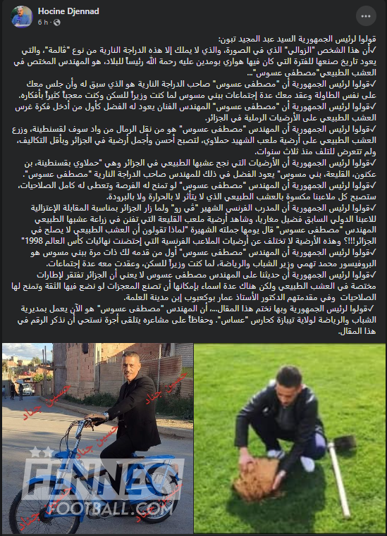 Djennad a souligné l’importance de Mustapha Assous, un ingénieur spécialisé dans le gazon naturel, dont le travail a eu un impact significatif sur le sport en Algérie. Ce message vise à attirer l’attention de Tebboune sur les contributions de Assous et à plaider pour une reconnaissance méritée. Avant de dévoiler ce message poignant, voici un aperçu de ce que Djennad a exprimé :